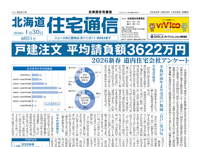 2026年1月30日、北海道住宅通信 第851号を発行しました。 第一面は、『戸建注文 平均請負額3622万円』です。 北海道住宅通信社は、道内で主に新築戸建住宅を手掛ける住宅会社160社を対象に、2025年の業績や経営環境、労務状況に関する無記名のアンケート調査を行い、82社から回答を得た(回答率51.3%)。86年(昭和61年)から毎年行っている調査で、今回が40回目。回答し...続き