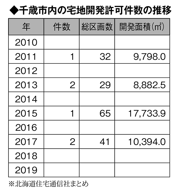 同市内では、ecoaハウス(千歳市)が2017年7月に長都駅前2丁目で開発許可を得た28区画を最後に約3年間、宅地開発が行われていない。