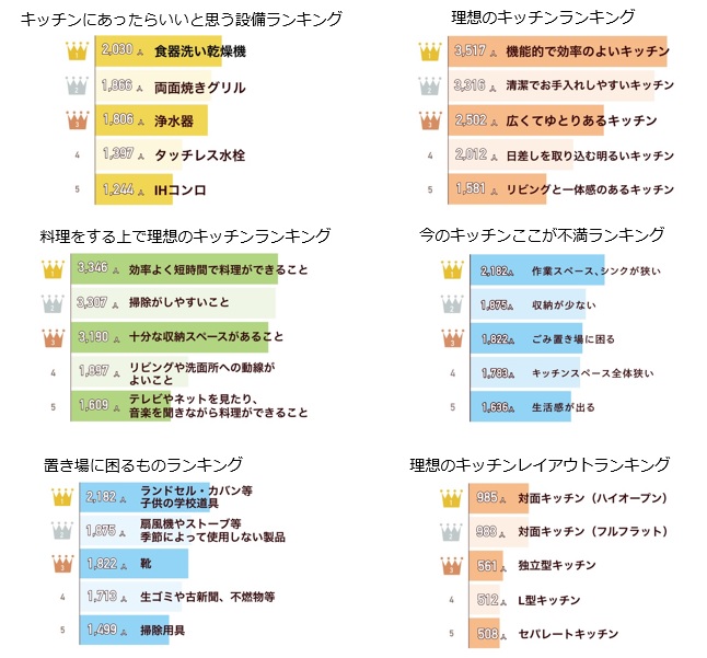 料理をする上で理想のキッチンランキングでは、「効率よく短時間で料理ができること」「掃除がしやすいこと」「十分な収納スペースがあること」が上位となっている。