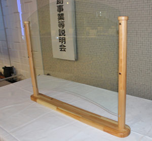 丸善木材(釧路管内釧路町)とハルキ(渡島管内森町)はこのほど、新型コロナウイルスの感染拡大防止に対応した飛沫防止パネルを作成した。特長はパネルの外枠や脚部に道産木材が使用されている点。