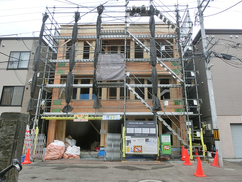 竹内建設とJ建築システム(ともに札幌市)は8月19日、札幌市中央区南8条西9丁目に建設している木造3階建の語学学校「明治アカデミー」の施工現場を公開した。道建設部と水産林務部の職員のほか、北海学園大の植松武是教授と学生たちも見学に訪れた。