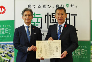 住宅金融支援機構が南幌町に感謝状 【フラット35】地域連携型で子育て支援 企業・団体 2022/10/30 毛利理事長(左)と大崎町長 住宅金融支援機構は10月14日、空知管内南幌町に感謝状を贈呈した。毛利信二理事長が町役場を訪問し、大崎貞二町長に直接手渡した。地域連携に関して自治体に理事長名の感謝状を贈るのは初めて。 同町は2017年に住宅金融支援機構と連携協定を締結。子育て世代の移住を積極的に推進してきた。