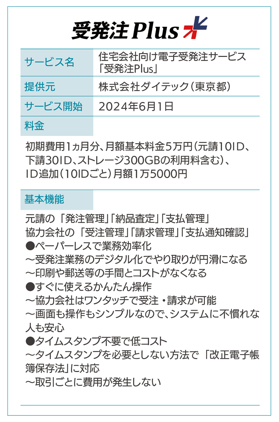ダイテックは6月1日、新しいクラウドサービス「受発注Plus」の申込み受付を開始した。電子受発注に必要な機能を搭載した住宅会社向けのサービスで、印刷や郵送の手間が省けるほか、タイムスタンプを必要としない方法により「改正電子帳簿保存法(電子取引)」に対応する。
