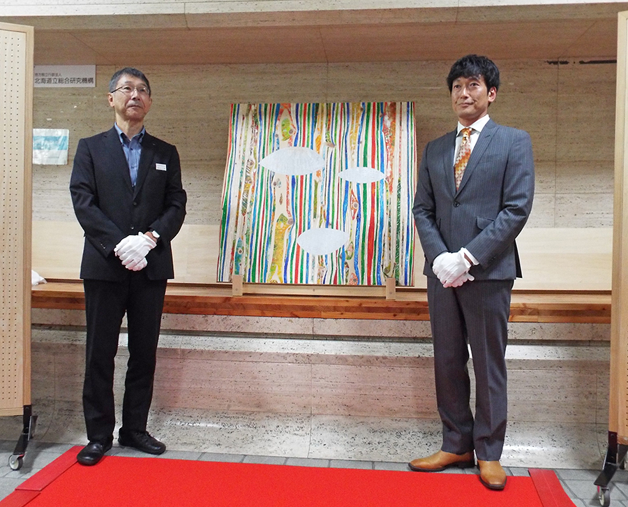 オクラホマ藤尾氏の絵画を道庁に展示 北方型住宅PRの一環として イベント 2024/8/30 お披露目する藤尾氏(右)と大野企画監 道は8月19日、2021年から北方型住宅PR大使を務めるタレントの藤尾仁志氏(オクラホマ)による絵画「揺らぎと調和」展示セレモニーを道庁本庁舎1階で開催し、除幕式を行った。