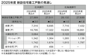 北洋銀、道銀が経済見通しを発表 2025年度 ともに2万7000戸台を予測 情報・サービス潮流 2024/12/15 北洋銀行と北海道銀行はこのほど、2025年度の北海道経済の見通しを発表した。毎年12月にそれぞれ発表しているレポートで、8月に改訂版を出している。