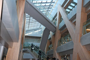 地上4階建、一部鉄骨造の木造建築物で、延床面積は8444㎡。設計、施工は竹中工務店(大阪市)。耐火集成材「燃エンウッド」を構造体に採用し、主要材には道産カラマツを100%使用する。エア・ウォーター北海道は「道内で一番大きな木造建築」と説明する。