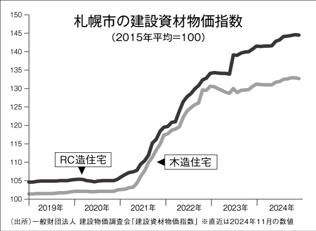 《2025年 北海道住宅通信社が予測!》先取り10大トピックス⑥ Topics6 どうなる?建築資材価格 潮流 2025/1/15 状況は変わらず むしろ悪化へ 2024年の建築資材価格は高騰が続いた。住宅建材・設備メーカー4社、断熱材メーカー1社がすでに年明けからの値上げを公表。(一財)建設物価調査会の建設資材物価指数を確認しても、木造住宅、RC造住宅のいずれも上昇基調が続いている(図参照)。
