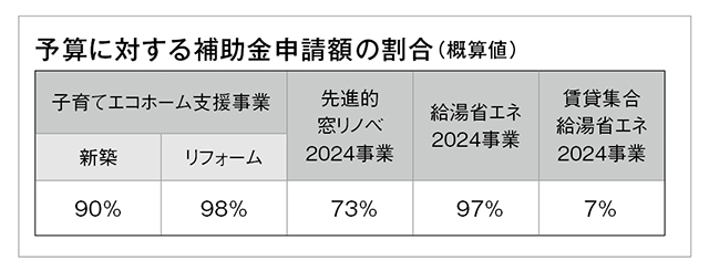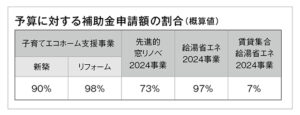 住宅省エネ2024キャンペーン 全事業が予算到達前に終了 国 2025/1/30 国土交通省、経済産業省、環境省の連携事業「住宅省エネ2024キャンペーン」の月別交付申請状況の統計が1月10日に公表された。 交付申請受付は2024年12月31日に終了したが、予算上限に達した事業はなかった。予算に対する補助金申請額の割合は、「子育てエコホーム支援事業」の新築が90%、リフォームは98%、先進的窓リノベ2024事業」は73%、「給湯省エネ2024事業」は97%、「賃貸集合給湯省エネ2024事業」は7%だった。