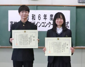 道主催 高校生建築デザインコンクール 生徒のアイデア光る作品を表彰 イベント 2025/2/28 受賞した五十嵐さん(右)と樋口さん 道は2月6日、「2024年度高校生建築デザインコンクール」の表彰式を札幌工業高校で行った。同校建築科3年の五十嵐いおりさんが最優秀作品賞、同じく3年の樋口龍海さんが佳作を受賞し、それぞれ賞状と記念品が授与された。 同コンクールは、道内の建築系学科のある高校の生徒を対象に1996年に始まり、今回で29回目。全道6校から46作品の応募があり、最優秀作品賞1点、優秀作品賞3点、佳作4点、特別賞2点が選ばれた。