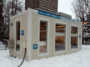 YKK AP さっぽろ雪まつりで実証実験 「窓で発電」ペロブスカイト使用 情報・サービス 2025/2/28 会場に設置されたサッポロゼロボックス 札幌市とYKK AP(東京都)は、さっぽろ雪まつり開催期間中の2月4日から11日まで、GX脱炭素エリア(大通会場3丁目)に「SAPPORO ZERO BOX(サッポロゼロボックス)」を展示した。 札幌市とYKK APが1月に連携協定を締結した「建材一体型太陽光発電(BIPV)」の実証実験の一環で、太陽光と雪面反射による発電量などのデータ収集を行った。