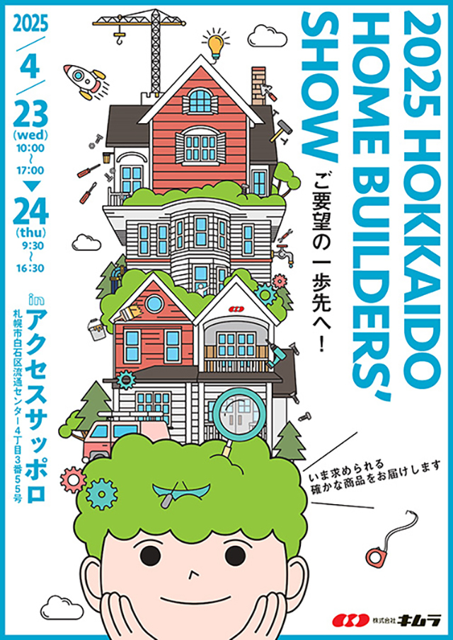 建築資材商社のキムラ(札幌市)は、住設・建材商品の展示即売会「2025北海道ホームビルダーズショー」を4月23(水)、24(木)の両日、アクセスサッポロ(札幌市白石区流通センター4丁目)で開催する。