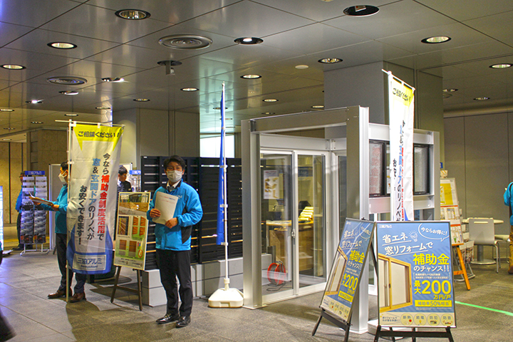 三協アルミ 地下歩行空間で展示会 一般ユーザーの認知度アップ イベント 2025/3/30 実物展示を行った 三協立山㈱三協アルミ社(富山県高岡市)北海道支店は3月14日、「住宅・エクステリア合同展示会」を札幌駅前地下歩行空間の北大通交差点広場東で開催した。 一般ユーザーを対象とした道内におけるPR活動の一環で、昨年に続き2回目。 エクステリアは、人工木デッキ「ヴィラウッド」の実物を展示。ガーデンファニチャー「Kayu style(カユスタイル)」のスツールも展示し、コーディネートの提案を行った。