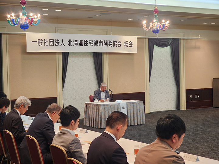 北住都が2025年度通常総会 全国大会への協力を呼び掛け セミナー 2025/6/15 会員各社の一層の連携を確認した (一社)北海道住宅都市開発協会は5月26日、札幌市内で2025年度の通常総会を開いた。 24年度の事業報告と決算報告、25年度の事業計画案および予算案、理事の補選などの議案を審議し、すべて原案通り承認した。 冒頭、高山壽雄理事長は「業界はコロナ禍を乗り越えたものの、物価高騰により厳しい状況が続いている。価格面ではもはや一企業だけでは対応は難しい。協会を通じた連携がますます必要である」と述べ、「会員各社の課題について共に乗り越える決意が必要だ」と訴えた。