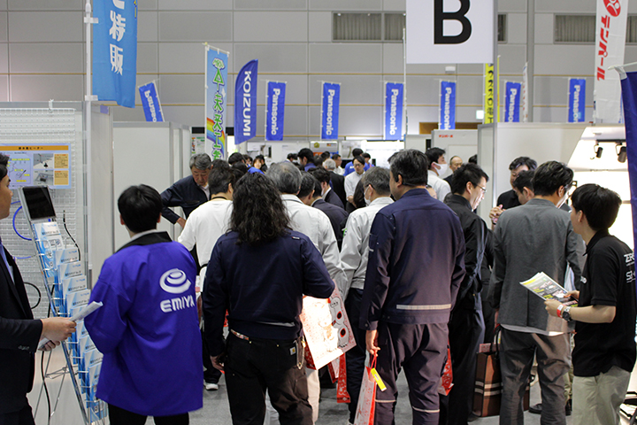 今年で16回目の開催。出展社数は前年と同規模の88社。「300mの異次元回廊」と名付けた特徴的な会場レイアウトで、入り口から出口まで分岐のない一本道の展示スペースに住設機器、照明、家電、情報通信機器、電路配電設備、電線ケーブル、資材工具などの製品が並ぶブースが連なり、大勢の来場者が切れ目なく練り歩いた。