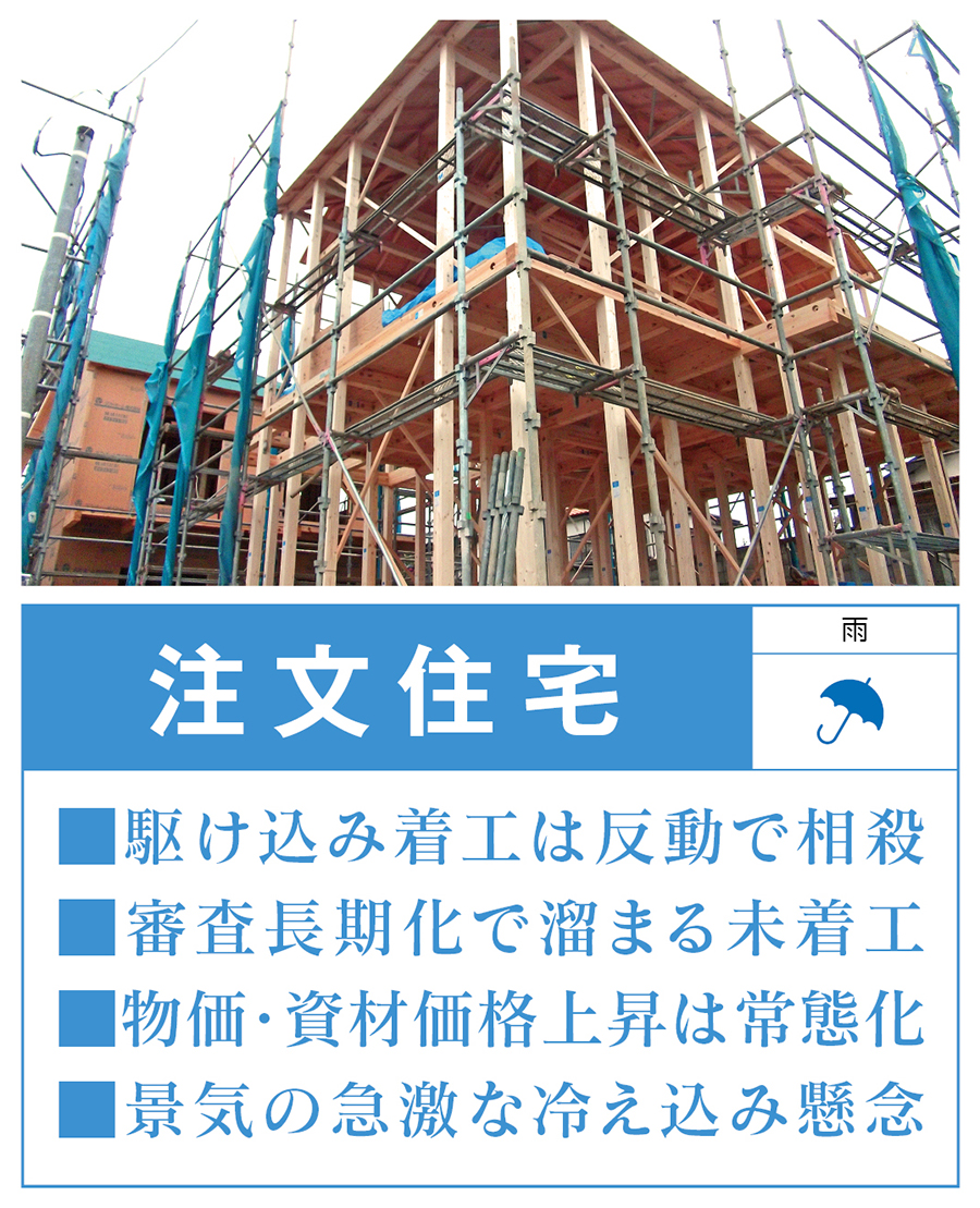 本道の住宅業界2025年下期 市況予想天気図【注文住宅・建売住宅】 注文・建売ともに戸建は出遅れ 新制度移行の影響響く 潮流 2025/7/30 【注文住宅】持家着工 あてにならない上半期の数字 賃上げムードも景気動向は不透明 今年1~5月の全道の持家の着工戸数は、利用関係別の統計を確認できる1986年以降で最少だった前年同期をさらに6.2%下回る2583戸。 ただ今年、ここまでに関しては、例年とは決定的に違う要因が着工統計を左右している。省エネ基準適合義務化や4号特例見直しなどの新制度施行前の駆け込み着工とその反動、そして新制度下における確認審査現場の混乱だ。