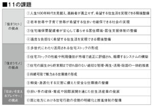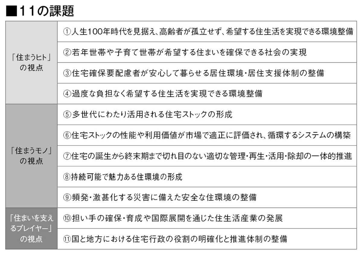 今回の中間とりまとめは、今後の検討を進めるに当たっての課題や方向性、施策のイメージ、留意点等を整理したもの。少子高齢化と人口減少が進む2050年を見据え、「住まうヒト(居住者)」「住まうモノ(住宅ストック)」「住まいを支えるプレイヤー(住宅・不動産事業者など)」の三つの視点から11項目の課題(表参照)を抽出し、50年に目指す住生活の姿および、当面10年間で取り組む施策の方向性を提示した。