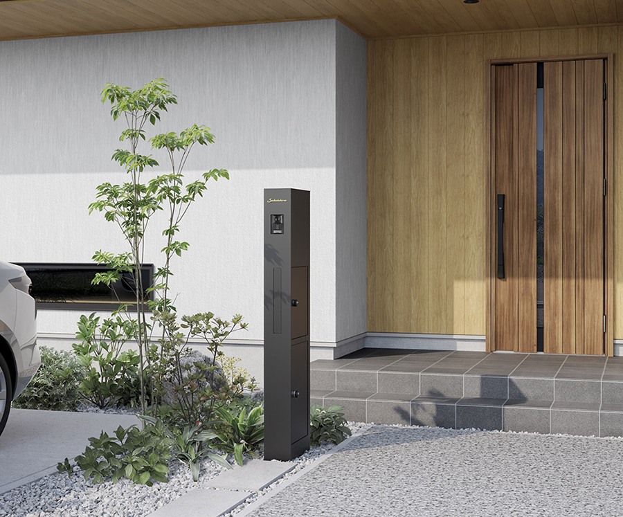 本体はスリムで無駄のないフォルムが特徴で、狭小地にも設置しやすく、住宅外観との調和性にも優れる。照明内蔵タイプでは、スリット照明がポールの位置を分かりやすく示すとともに、同一光源がポスト内部も照らす構造で、夜間の視認性と操作性を高めている。宅配ボックスはスリムながら、80サイズ(3辺合計84㎝)の荷物まで対応できる。