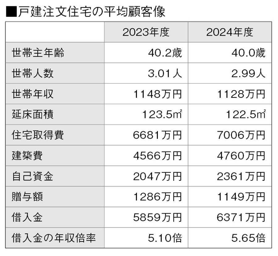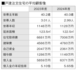 戸建注文住宅の平均顧客像について、世帯主年齢は40.0歳(前年度比0.2歳減)で、3年連続の40歳代となった。世帯年収は1128万円(同20万円減)で、2年連続で1100万円を超えた。住宅延床面積は122.5㎡(1.0㎡縮小)で、15年度以降縮小し続けている。