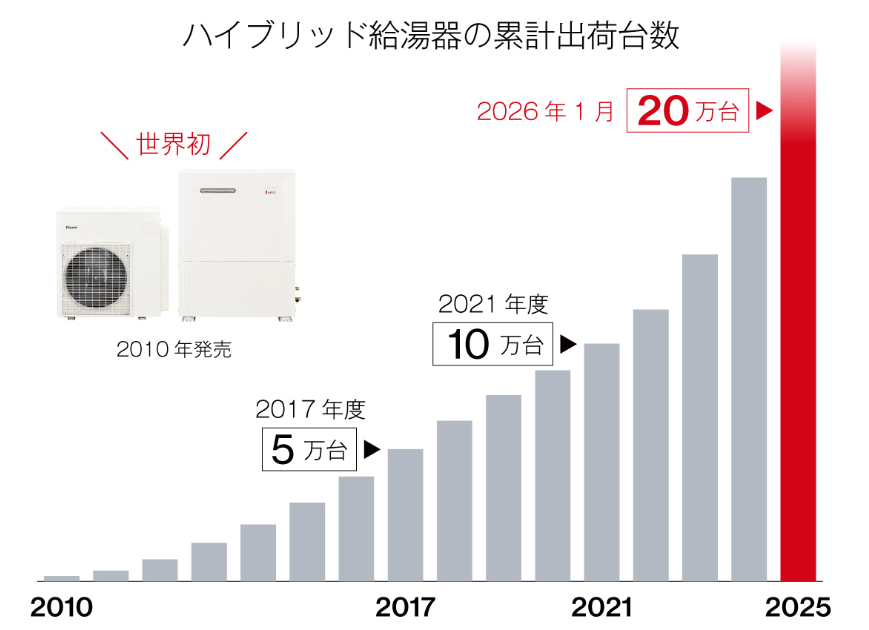 リンナイ ハイブリッド給湯器 累計出荷台数が20万台を突破 情報・サービス 2026/2/15 リンナイ(名古屋市)は1月26日、「ECO ONE(エコワン)」をはじめとするハイブリッド給湯器の累計出荷台数が、1月に20万台を突破したと発表した。 2010年の世界初導入から16年、政府の補助事業やZEHの普及を背景に、住宅市場での存在感を高めている。 ハイブリッド給湯器は、ヒートポンプ技術と潜熱回収型ガス給湯器(エコジョーズ)を組み合わせた高効率システム。家庭内エネルギー消費の約3割を占める給湯分野において、従来型のガス給湯器と比較して年間CO2排出量を56%削減できるのが最大の特徴だ。