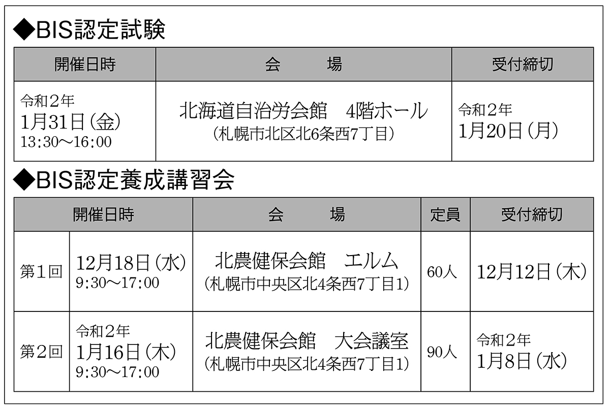 BIS認定試験および養成講習会の日程は別表のとおり。